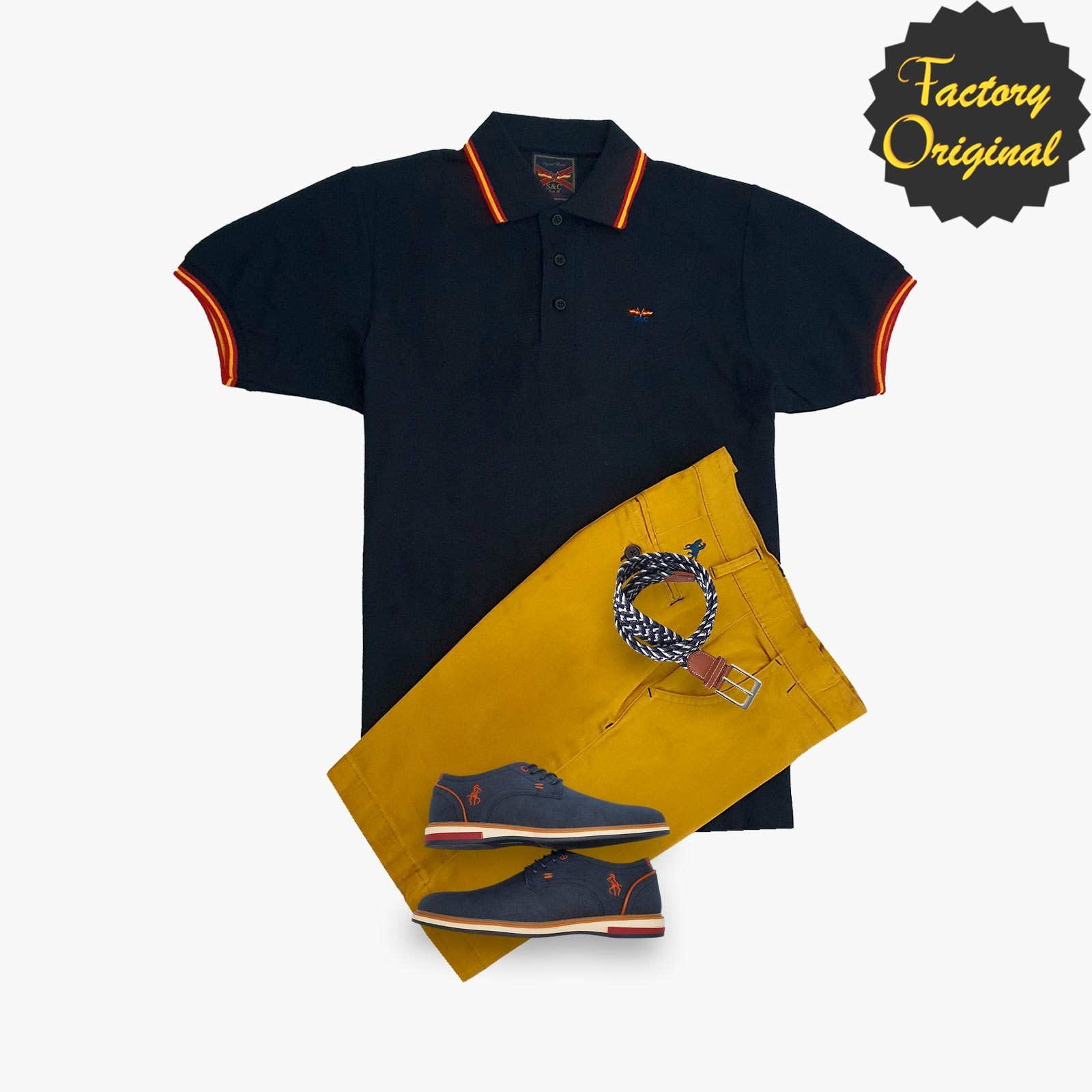 Pack Polo Fantasia rayado blanco Bermuda mostaza zapato marino de SYC Factory Original