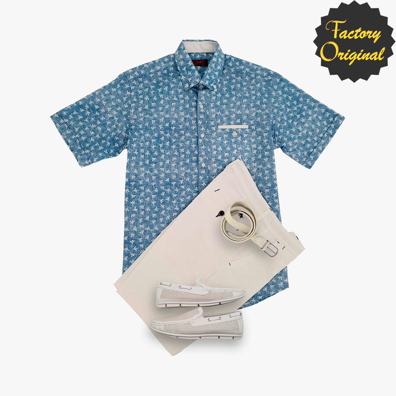 Pack camisa hombre manga corta flowers azul Bermuda blanca náutico premium airy blanco SYC Factory Original