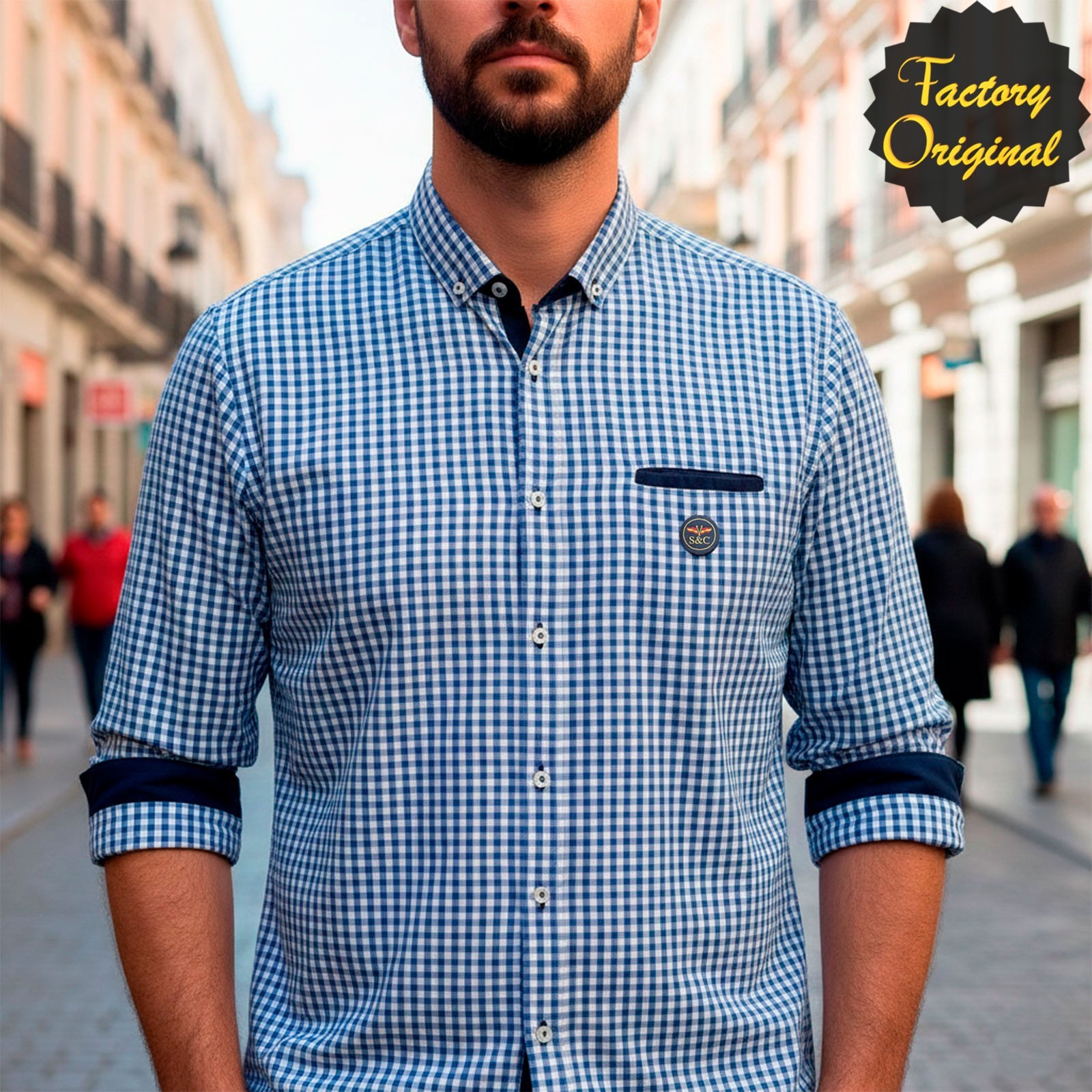CAMISA HOMBRE CUADRO VICHY AZUL CON CODERAS MARINO DE SYC FACTORY ORIGINAL