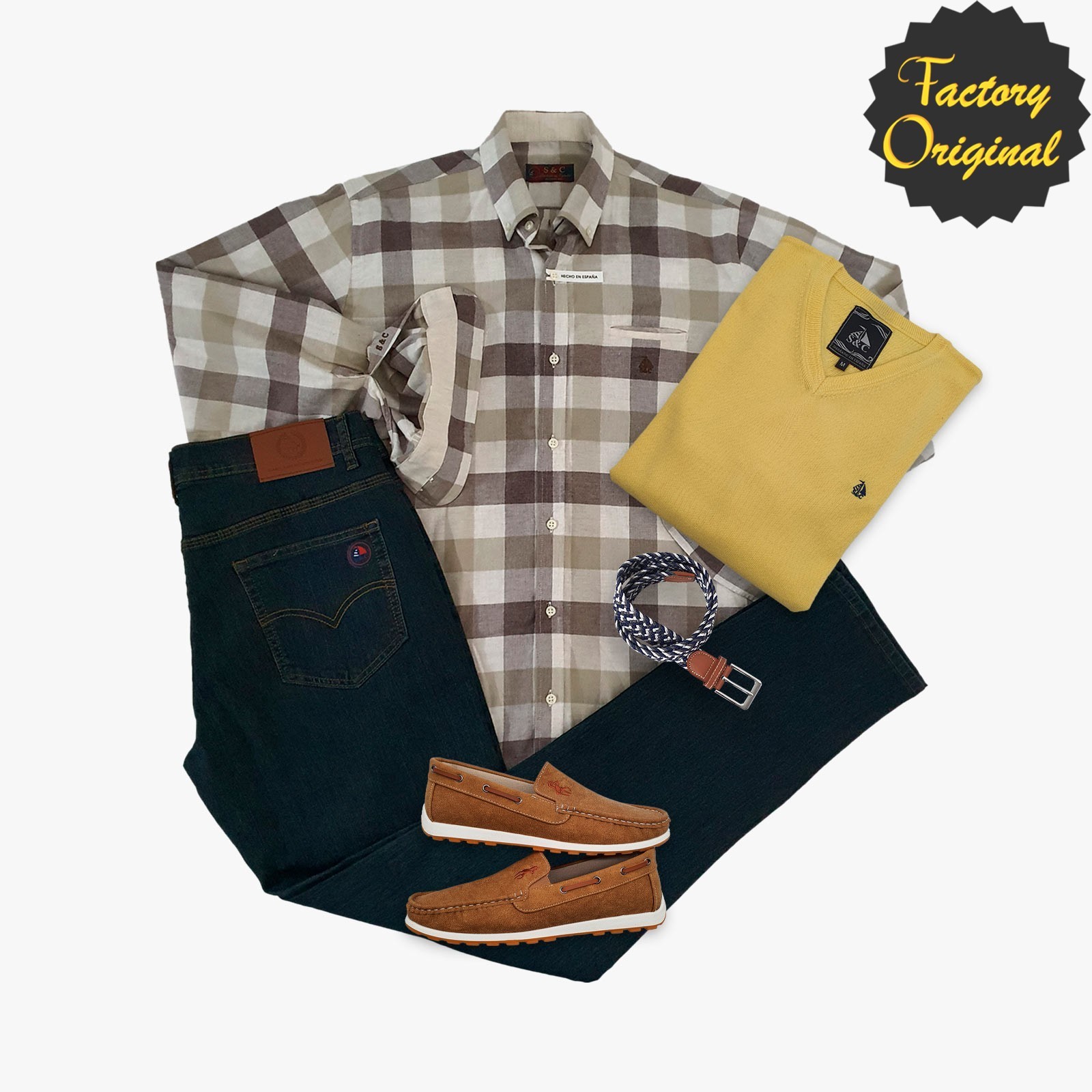 Camisa Hombre barco modelo binary beis pantalon vaquero oscuro Jersey barco amarillo nautico camel SYC FACTORY