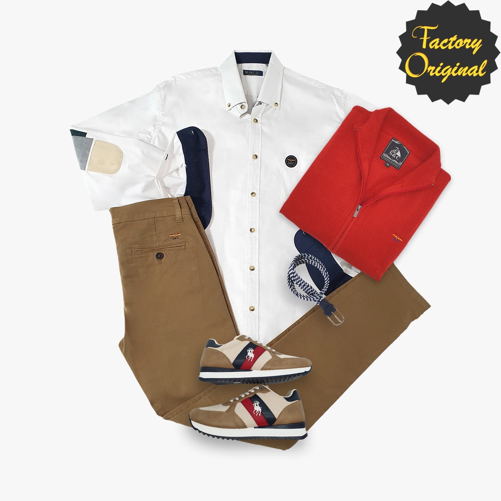 Pack Camisa patriota blanco multicoderas pantalon chino patriota camel rebeca patriota rojo deportivo nyck camel