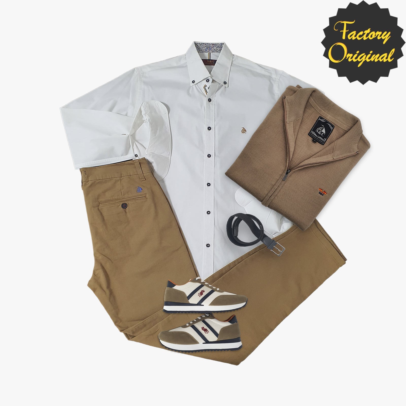 Pack Camisa barco blanca antonio pantalon chino barco camel rebeca patriota beis tostado deportivo santurce