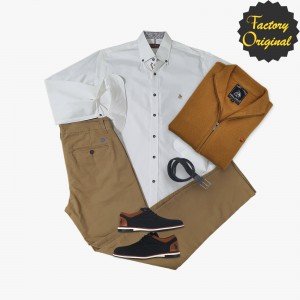 Pack Camisa barco blanca antonio pantalon chino barco camel rebeca patriota mostaza mocasin perry negro