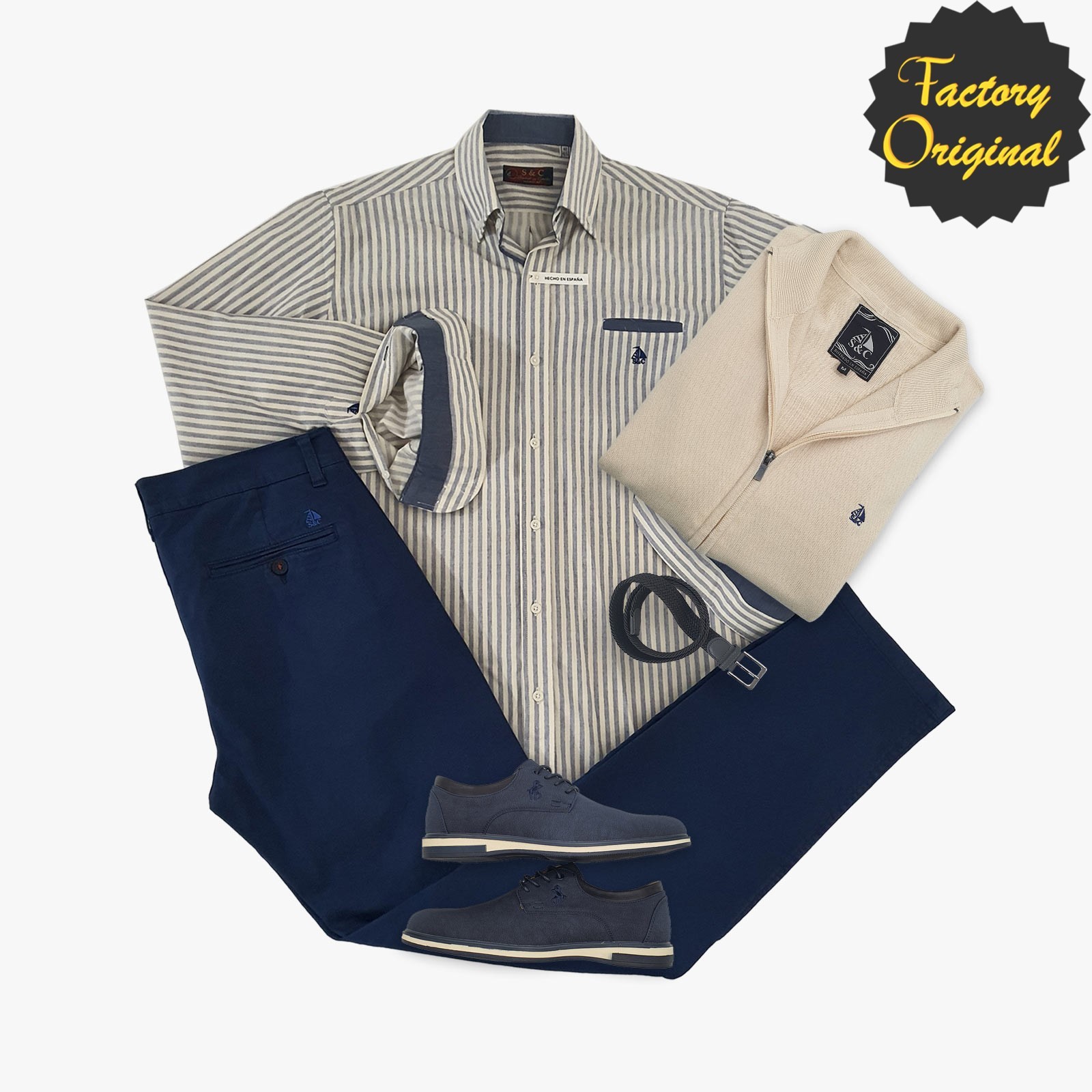 Pack Camisa barco jose pantalon chino barco azul royal rebeca barco beis mocasin rush marino