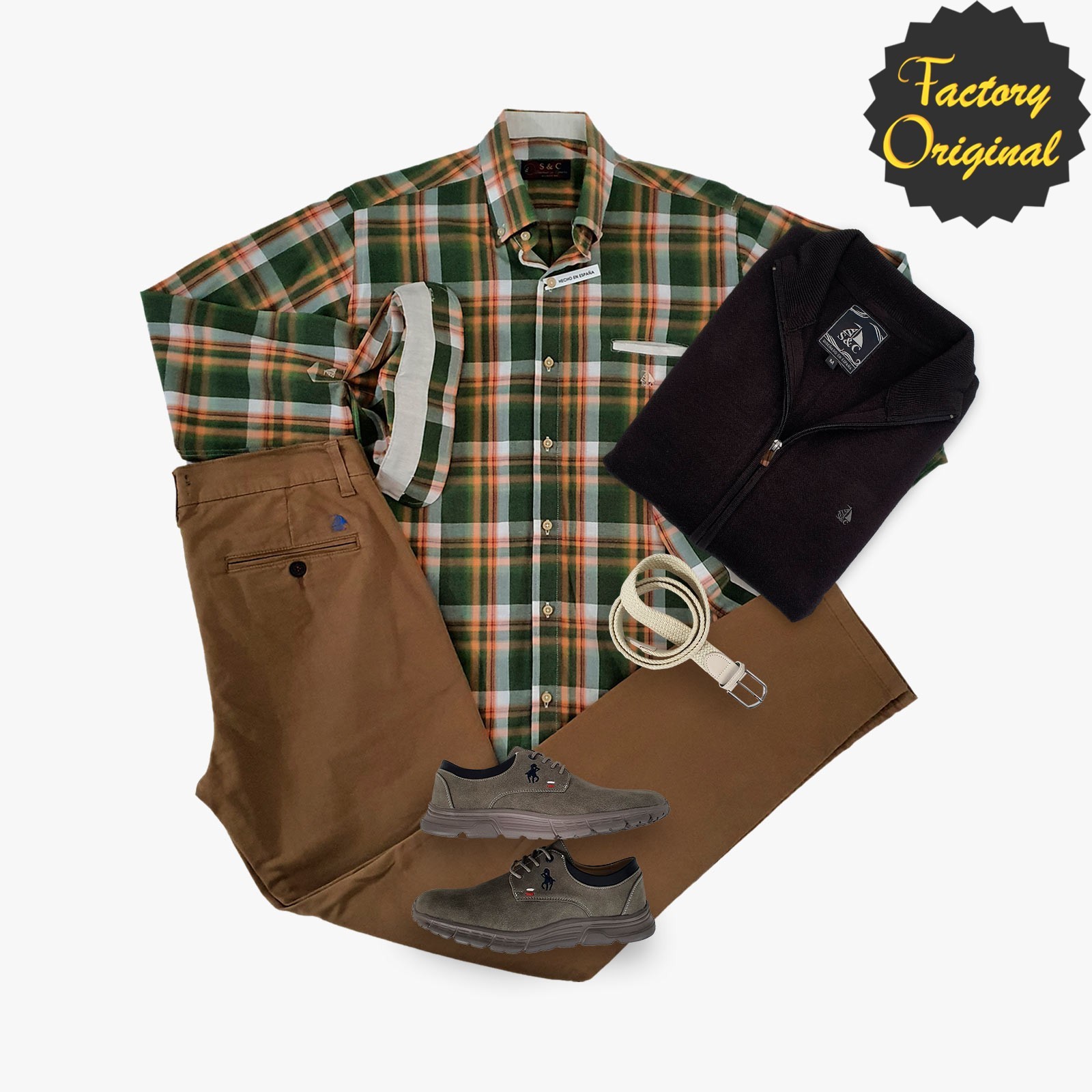 Pack Camisa barco modelo tail verde pantalon chino barco camel rebeca barco negro mocasin pluma gris