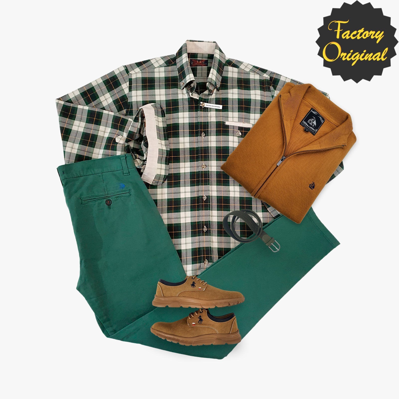Pack Camisa barco modelo pali verde pantalon chino barco verde rebeca barco mostaza mocasin pluma camel