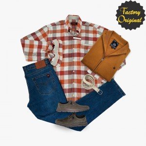 Pack Camisa patriota modelo binary rojo pantalon barco ibiza rebeca barco mostaza mocasin perry gris