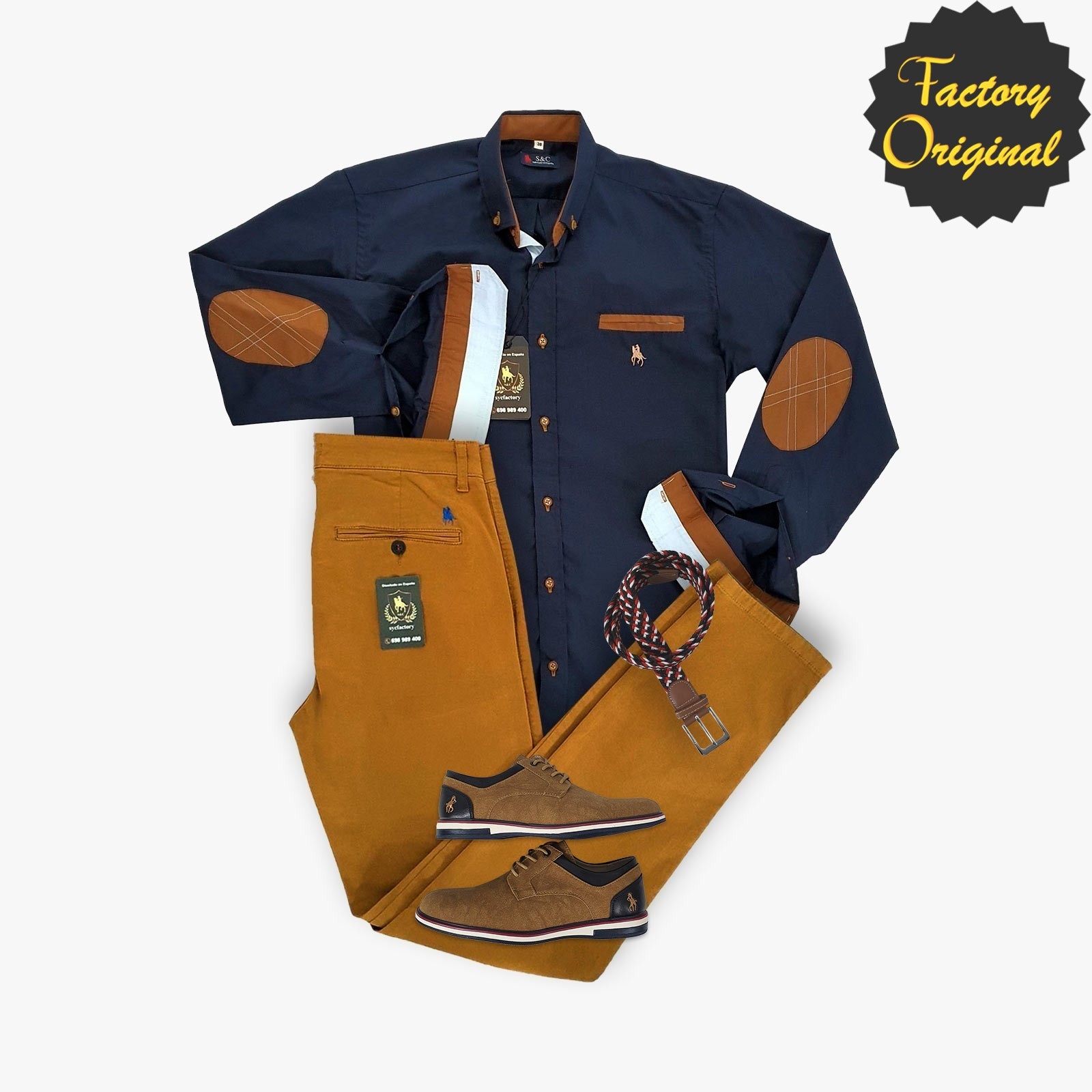 Pack camisa hombre marino con coderas camel pantalón chino camel zapato camel SYC Factory Original
