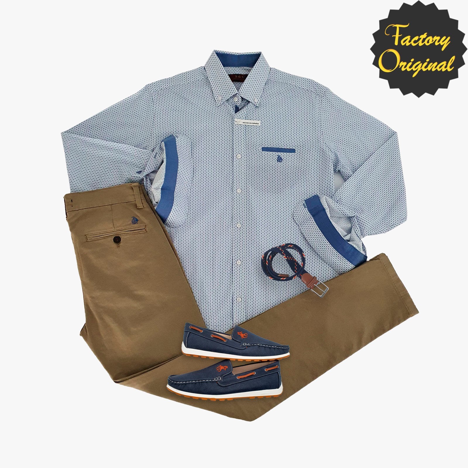 Pack camisa barco Beltrán azulón Pantalón chino barco bolsillo clásico beis tostado nautico pluma marino SYC Factory Original