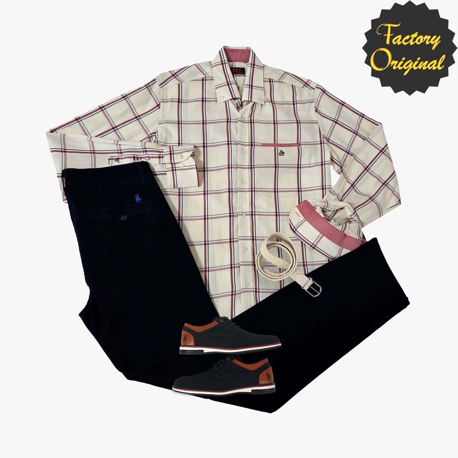 Pack camisa barco cuadro perla Pantalón chino micropunto negro mocasin perry negro SYC Factory Original