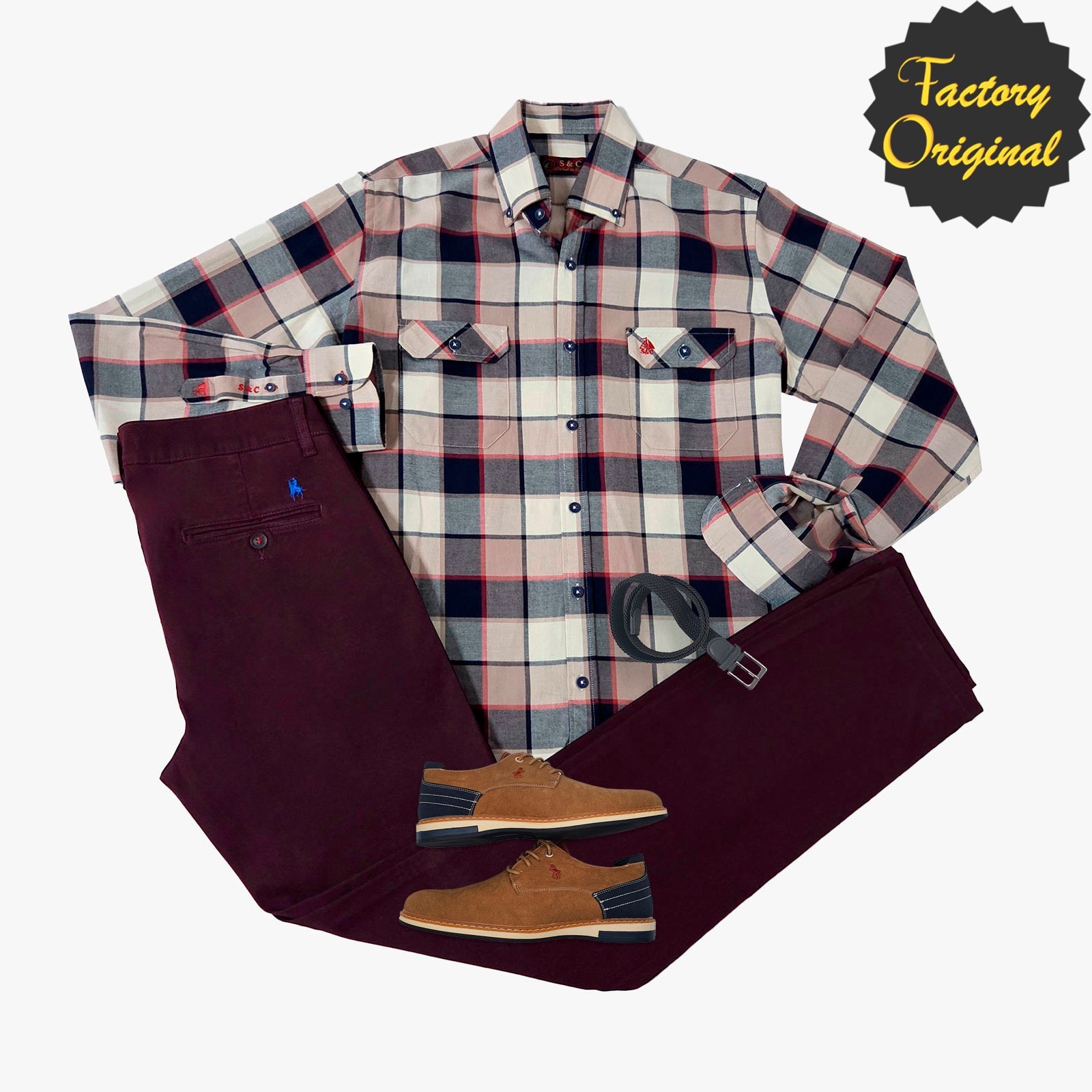 Pack camisa barco viella cuadro montana Pantalón chino micropunto granate mocasin terra camel SYC Factory Original
