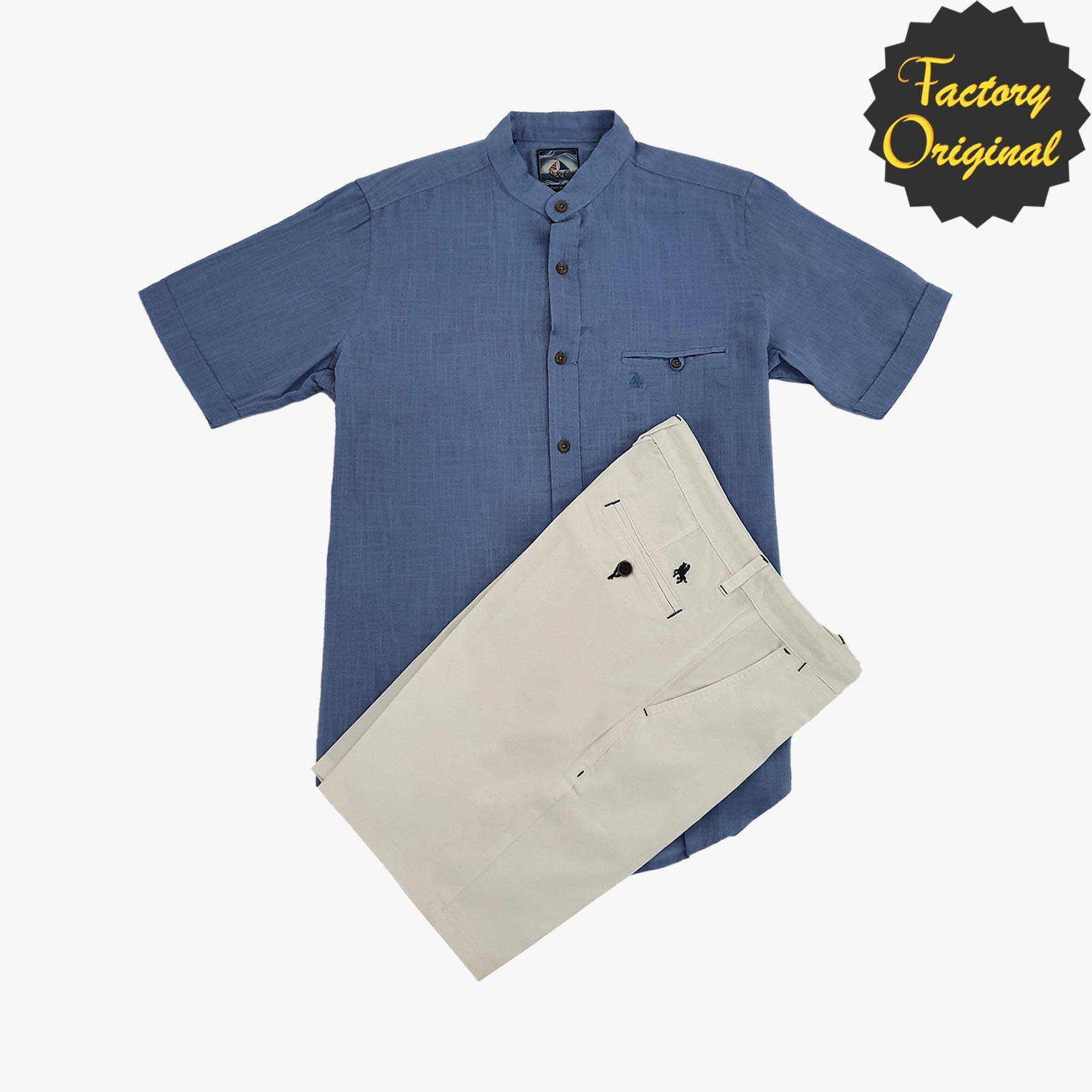 Camisa hombre manga corta tipo lino modelo Serenidad celeste cuello mao bermuda blanca SYC Factory Original