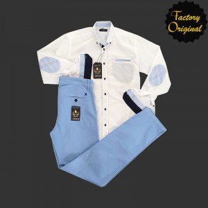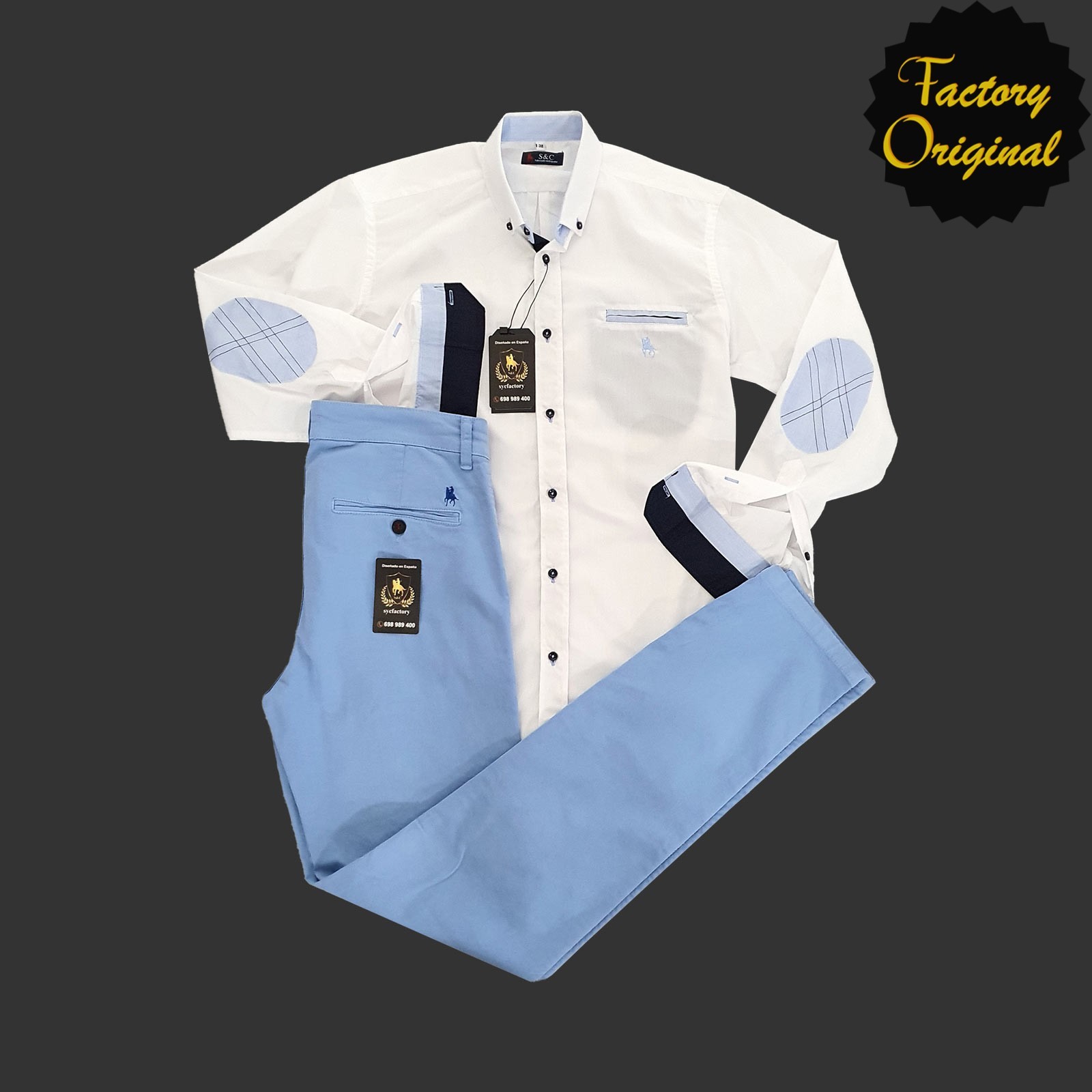 CONJUNTO DE PANTALON CHINO ELASTICO «CELESTE» CAMISA LISA BLANCA CON CODERAS CELESTE SYC FACTORY ORIGINAL