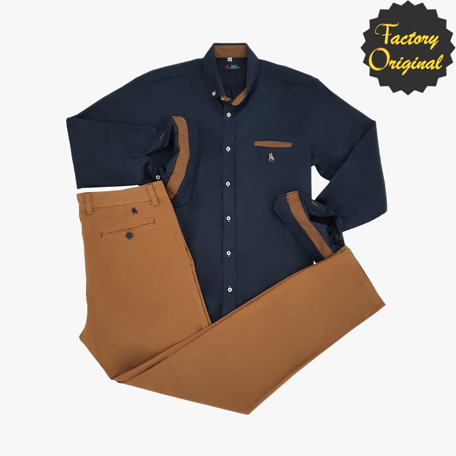 CONJUNTO DE CHINO ELASTICO CAMEL CAMISA MODELO CHICAGO MARINO SYC FACTORY ORIGINAL