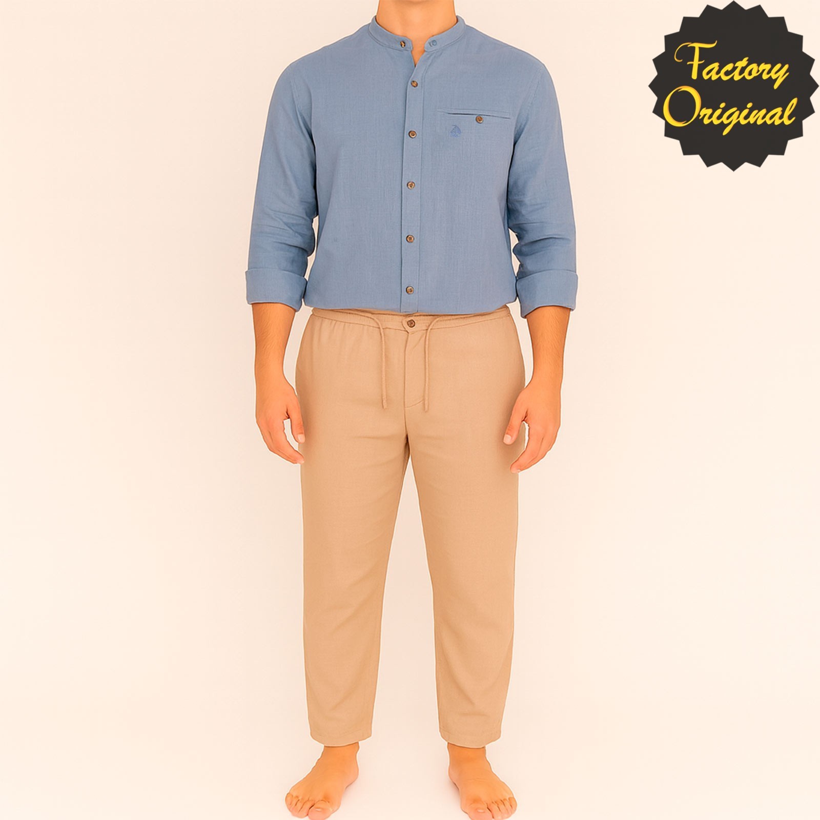 Conjunto pantalón lino beis camisa barco lino modelo serenidad celeste cuello mao SYC Factory Original