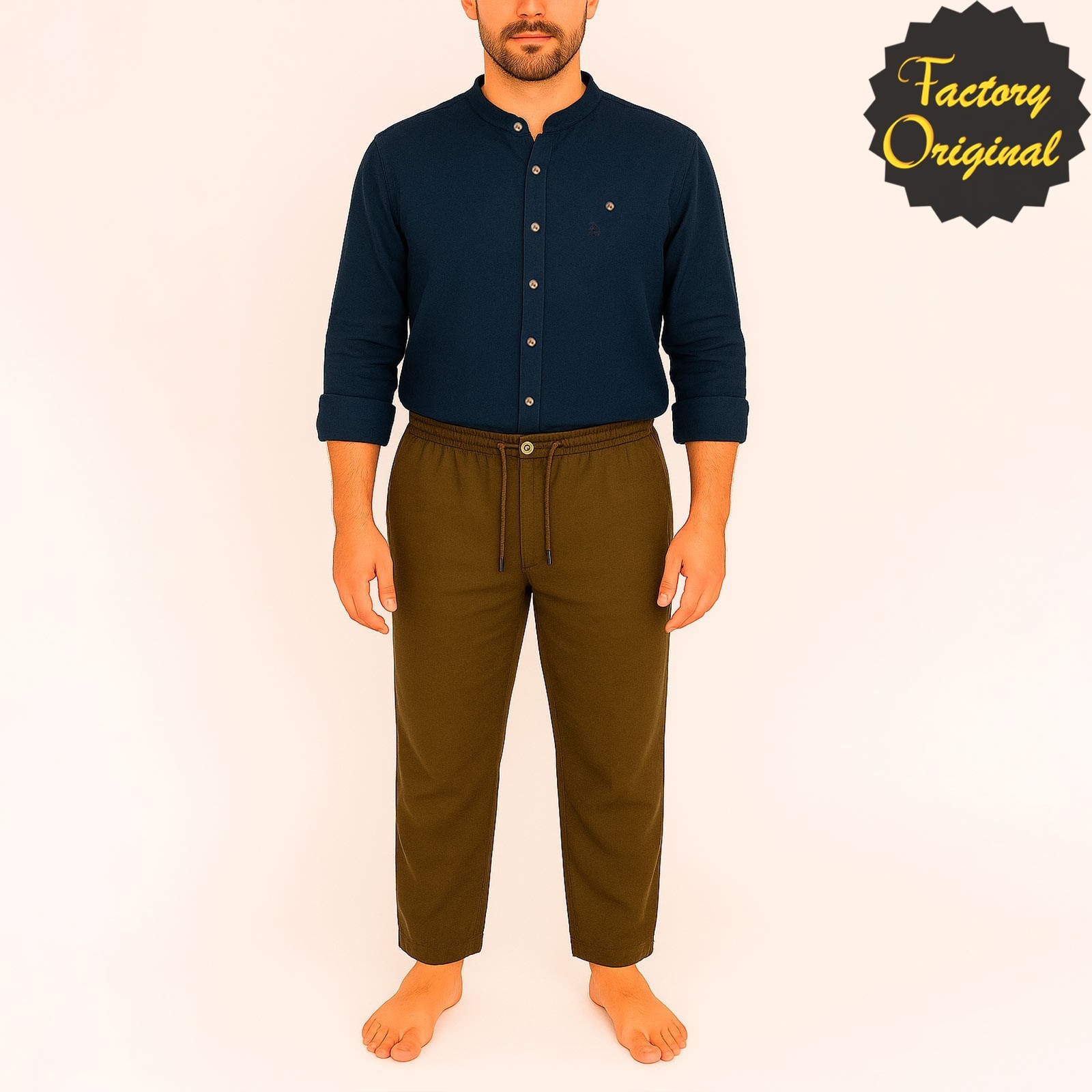 Conjunto pantalón lino kaki camisa barco lino modelo serenidad azul oscuro cuello mao SYC Factory Original