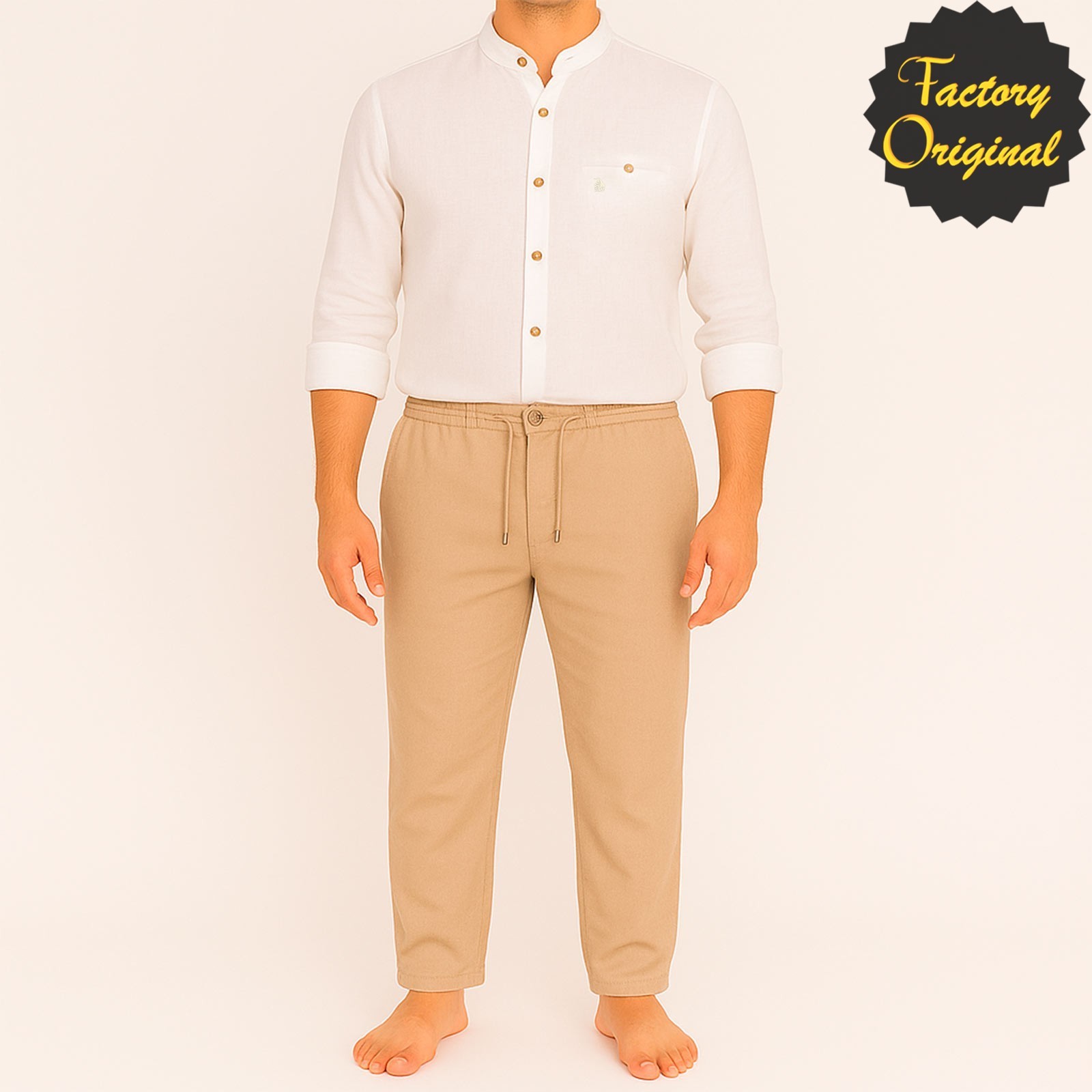 Conjunto pantalón lino beis camisa barco lino modelo serenidad blanco cuello mao SYC Factory Original