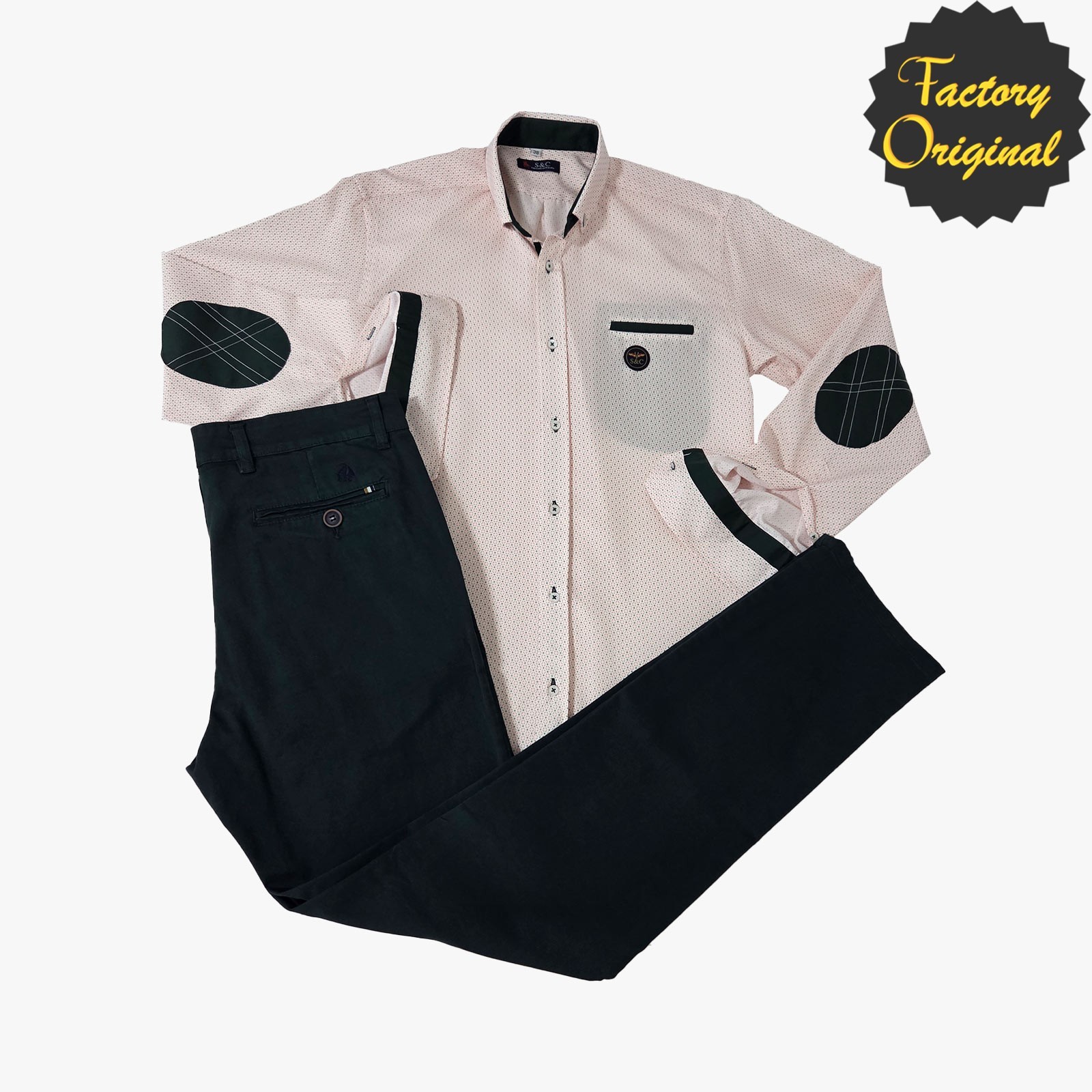 Conjunto pantalón barco bolsillo clásico verde oscuro camisa puntilleo rosa y verde SYC Factory Original