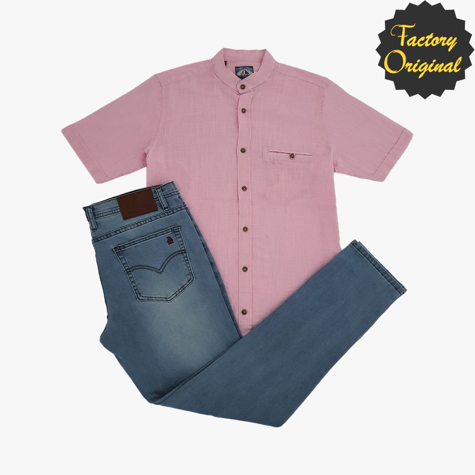 Conjunto pantalón barco Ibiza vaquero claro camisa manga corta tipo lino modelo serenidad rosa cuello mao SYC Factory Original