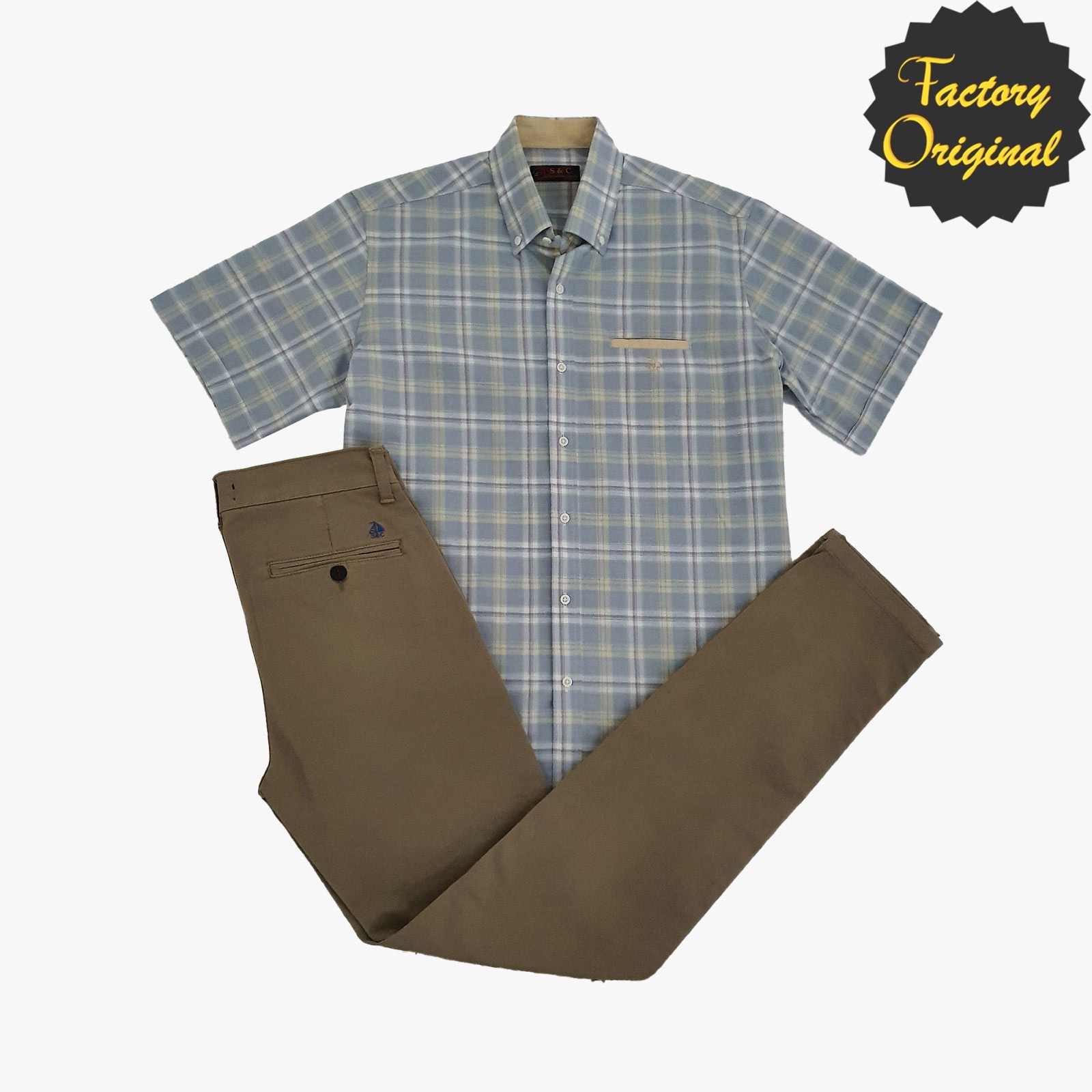 Conjunto pantalón largo chino barco camel camisa manga corta modelo escocia azul verdoso SYC Factory Original