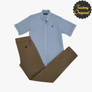 Conjunto pantalón largo chino barco beis tostado camisa manga corta lino modelo vértice azul SYC Factory Original