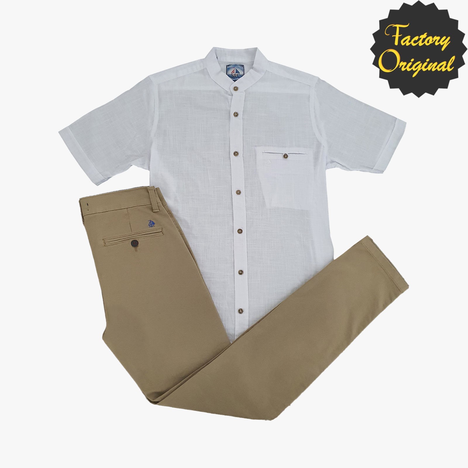 Conjunto pantalón chino barco beis tostado camisa manga corta tipo lino modelo serenidad blanco cuello mao SYC Factory Original