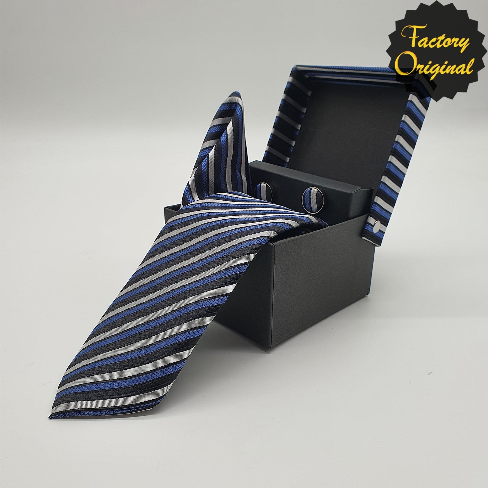 Pack Corbata, gemelos y pañuelo modelo trilineal marino de SYC Factory Original