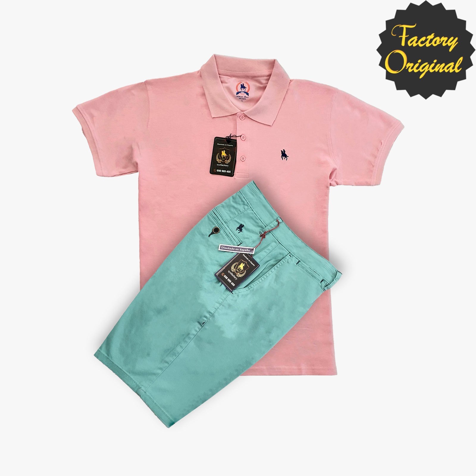 Conjunto de Bermuda elástica verde agua polo manga corta rosa palo SYC Factory Original